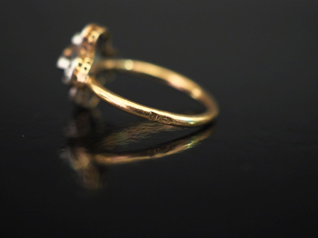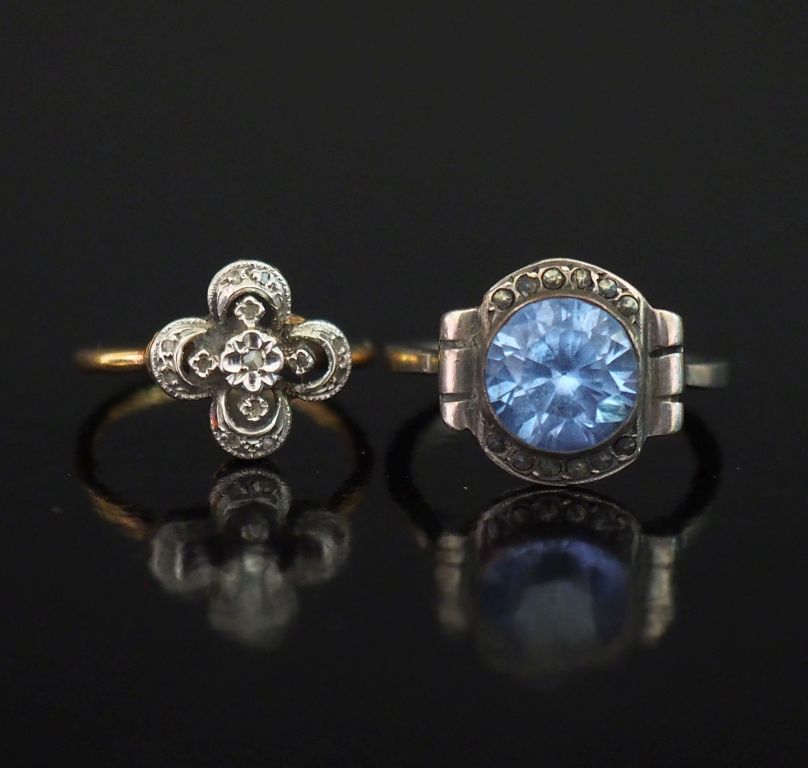 Ensemble comprenant : - une petite bague en or jaune 750, sertie en son centre d'une pierre à l'imitation du diamant. TDD. 45 - une bague en argent 925, sertie en son centre d'une pierre bleu ciel. TDD. 49 Poids tel. 5,58 g