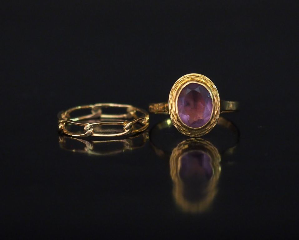 Ensemble comprenant : - une petite bague en or jaune, maille gourmette. TDD. 57 - une bague en or jaune, sertie en son centre d'une pierre mauve. TDD. 60 1/2 Poids tel. 3,90 g