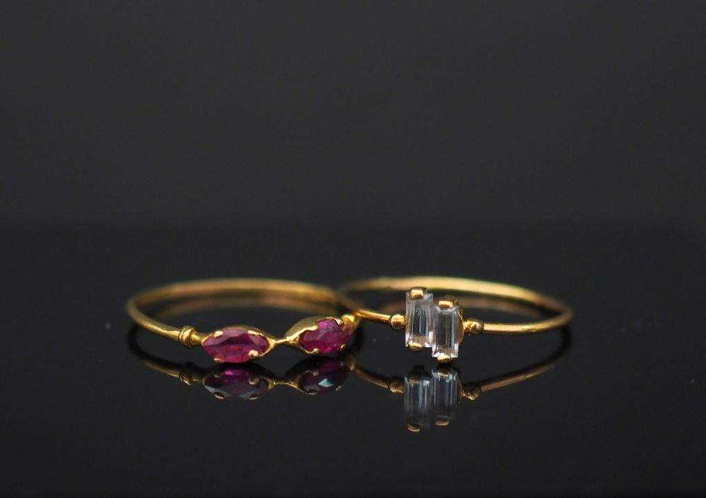 Ensemble comprenant : - une petite bague en or jaune, sertie de deux pierres roses. TDD. 55 - une petite bague en or jaune, sertie de deux pierres bleu ciel. TDD. 54 Poids tel. 1,60 g