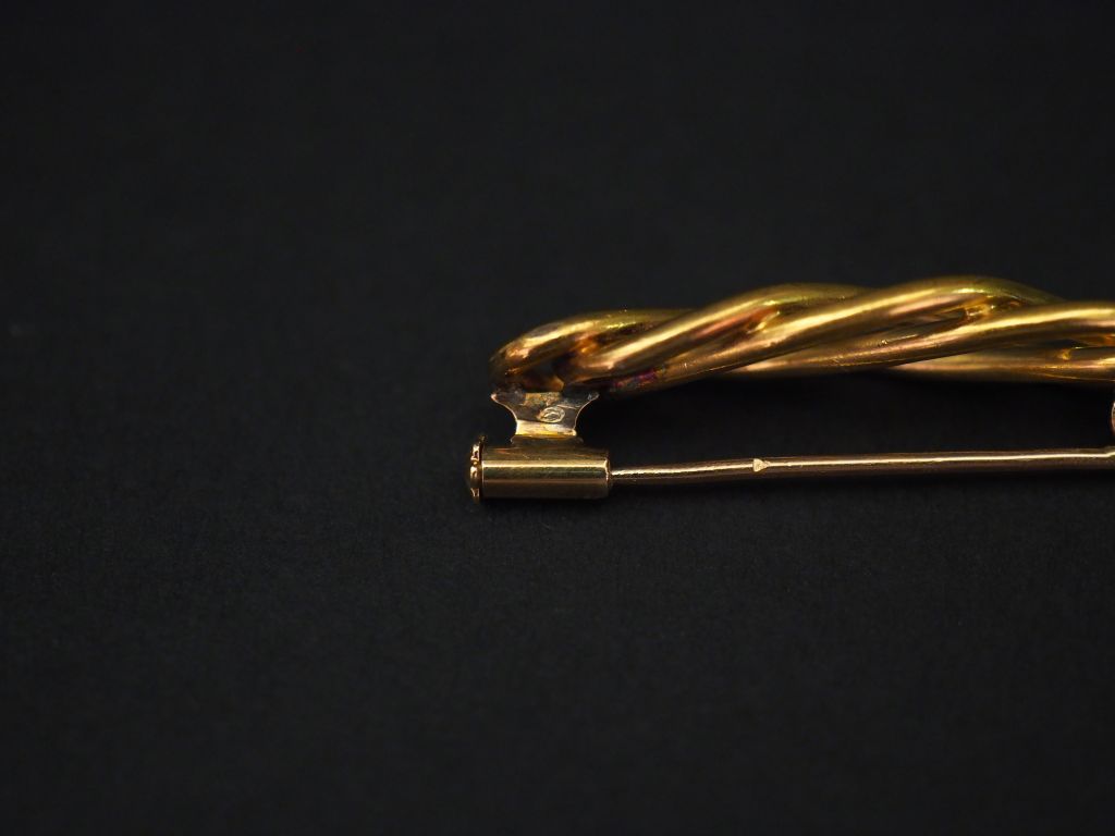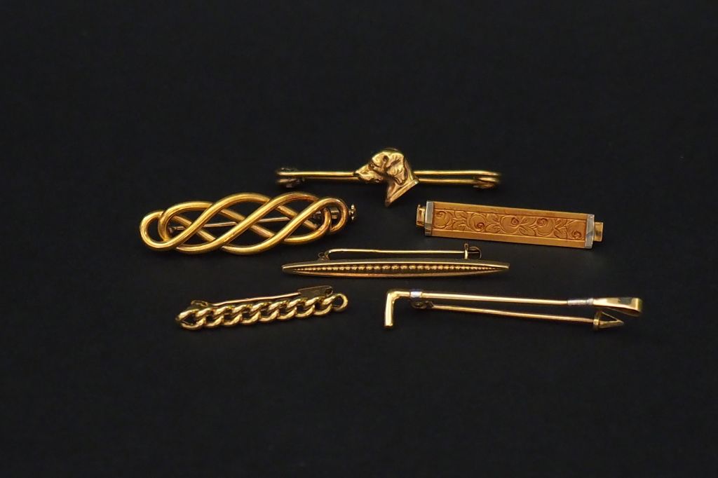 Ensemble comprenant : - une petite broche barrette en or jaune, à décor de rang de perles. Long. 3,8 cm - une broche barrette en or jaune, à décor de tête de chien de profil. Long. 4 cm - une broche en or jaune, à décor de motif torsadé. Long. 3,5 cm - une petite broche barrette en or jaune, maille gourmette. Long. 2,9 cm - une petite broche barrette de style Art déco deux tons d'or, à décor d'une frise de roses. Long. 3,2 cm - une broche en or jaune, en forme de canne de polo. Long. 4,2 cm Poids. 11,71 g