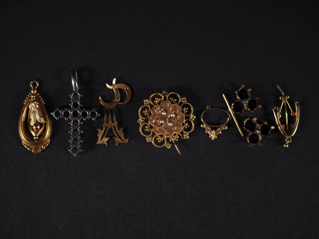 Ensemble de débris d'or 750 Poids : 11 g on y joint une broche en or et perles Poids tel : 2,26 g