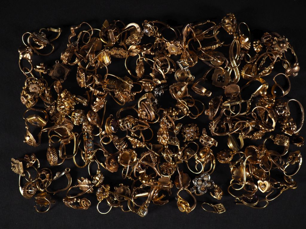 Ensemble de perce oreilles Napoléon III ou début XXème en or, quelques-uns agrémentés de perles et de pierres de couleur. Poids tel : 96,21 g