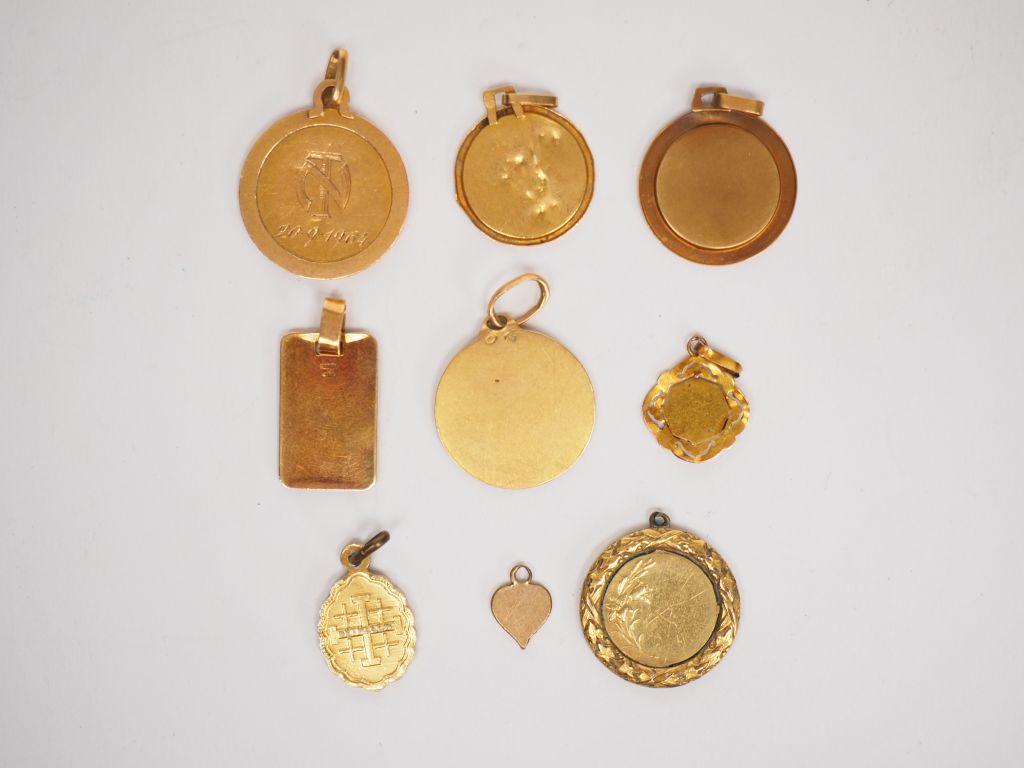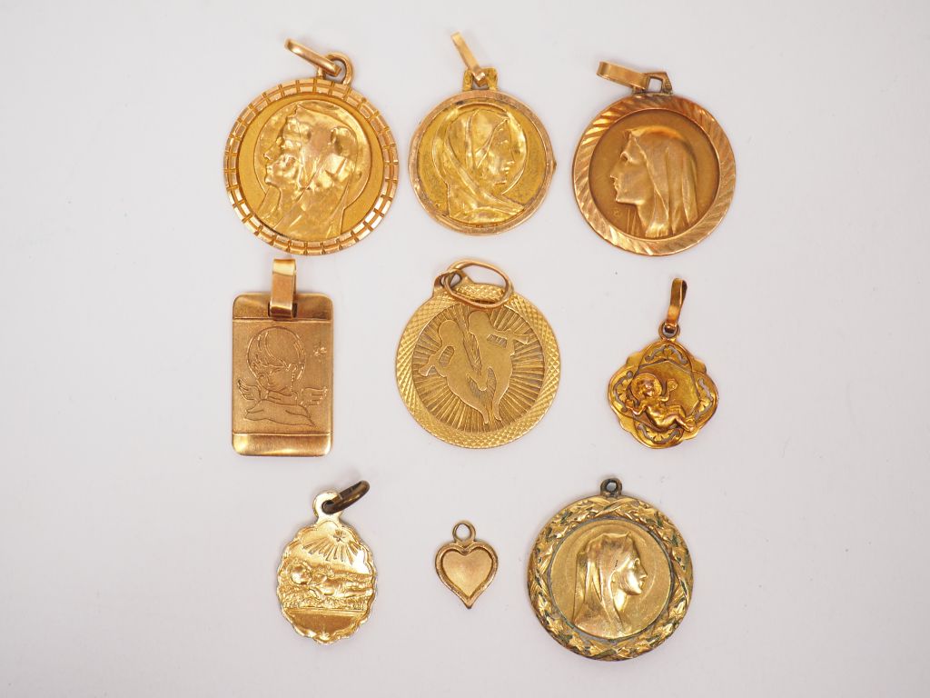 Ensemble de six médailles en or jaune. Poids. 9,17 g (une gravé, enfoncements) On y joint deux médailles en plaqué or ou métal doré et un petit pendentif en métal doré en forme de cœur.