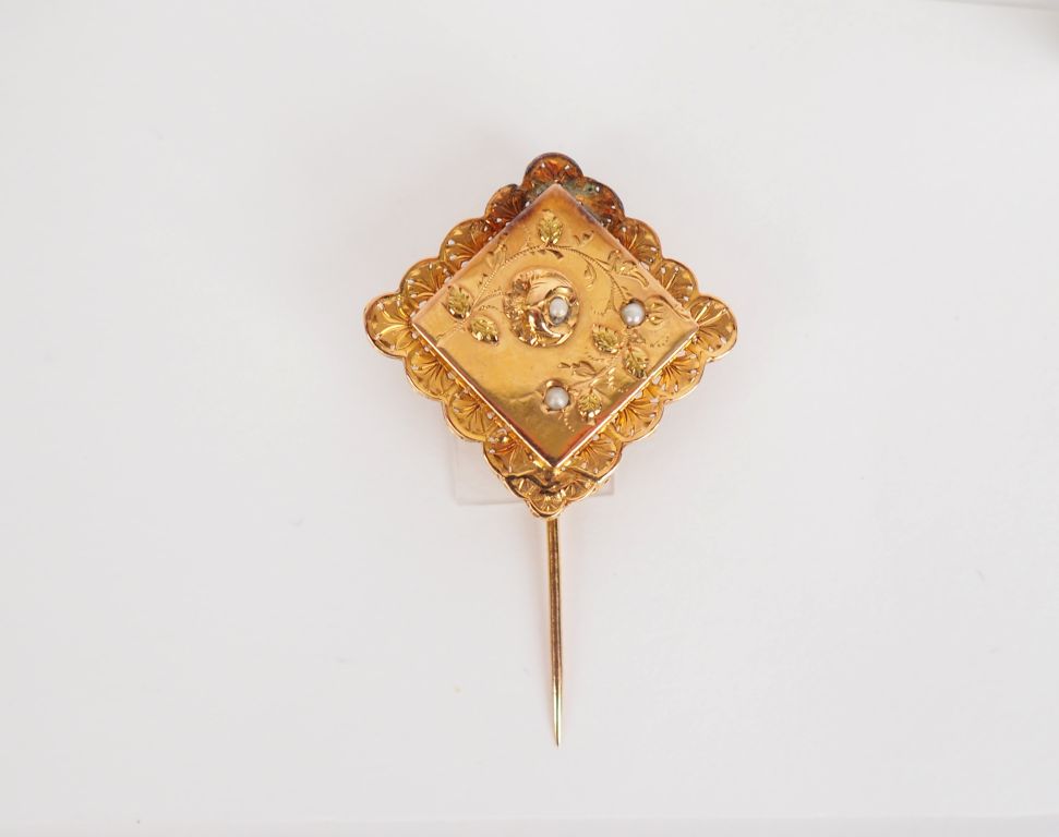 Epingle en or jaune et perles, à décor de branchage fleuri. Poids tel. 1,93 g