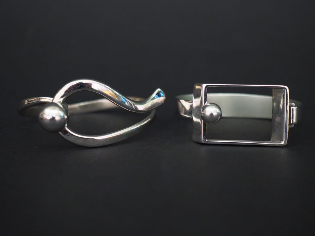 Fabrice PELLETIER Bracelet en argent de forme mouvementée, à décor d’une boule. Signé. Poids. 25,20 g On y joint un bracelet en métal, à décor d’un rectangle agrémenté d’une boule.
