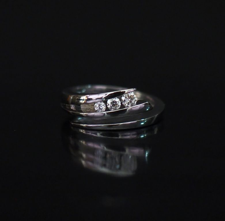 GAREL Bague "Trilogy" en or blanc, sertie d'une ligne de trois petits diamants. Jolie monture ajourée et stylisée. TDD. 52 Poids tel. 6,10 g