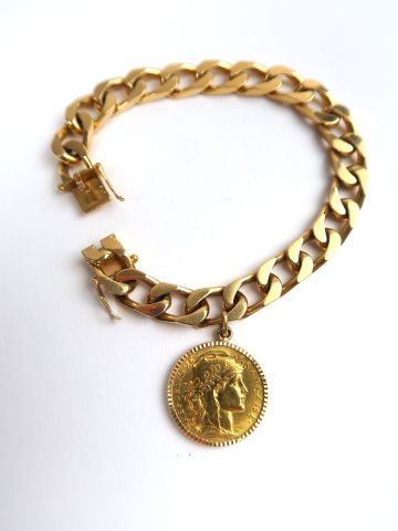 Gourmette en or, maille cheval, retenant une pièce de 20 francs or en pendentif. Poids : 57,11 g