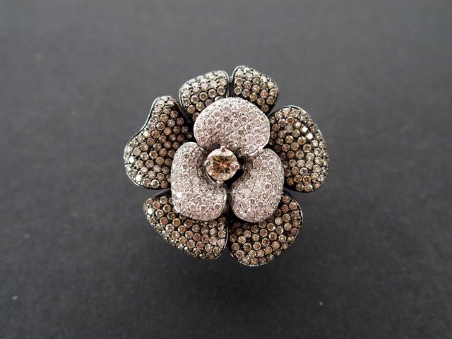 GROUPE VENDÔME JOAILLERIE. Bague or blanc modèle "Flower Field", pavage de brillants et de diamants bruns et orné en son centre d'un brillant de 0,30 cts environ. TDD 53,5 Poids tel: 9,7gr