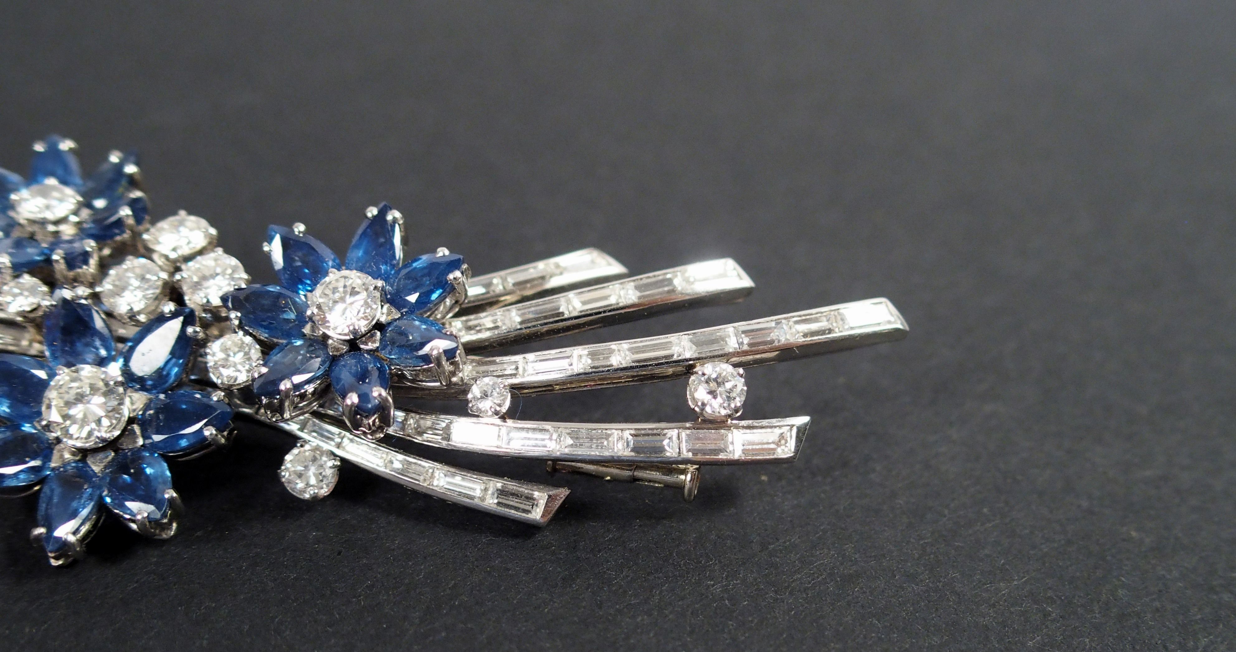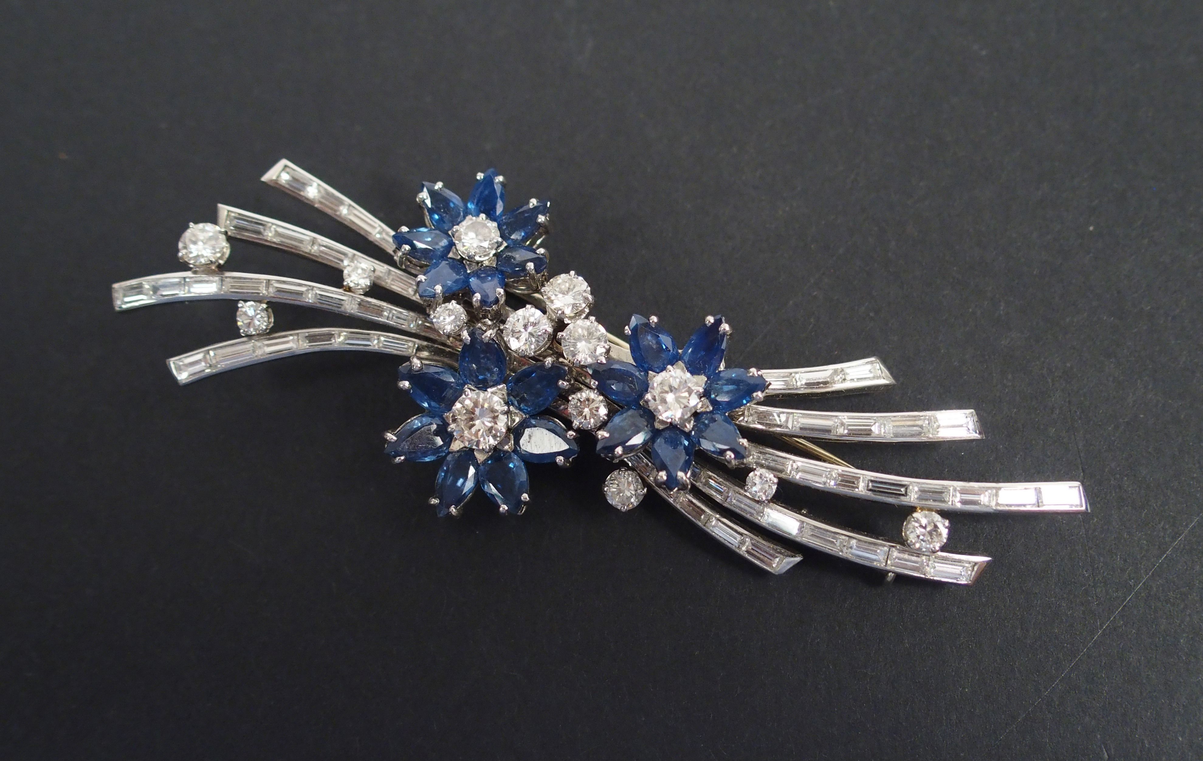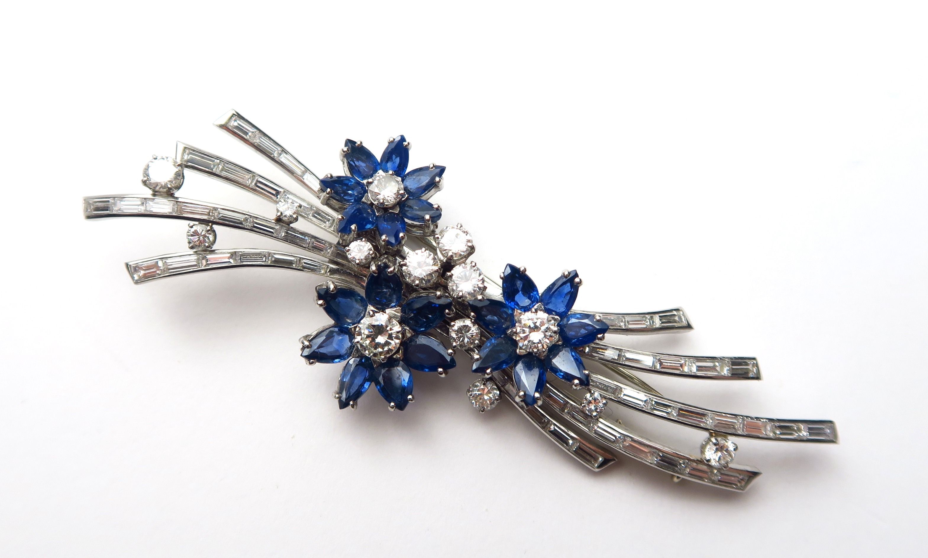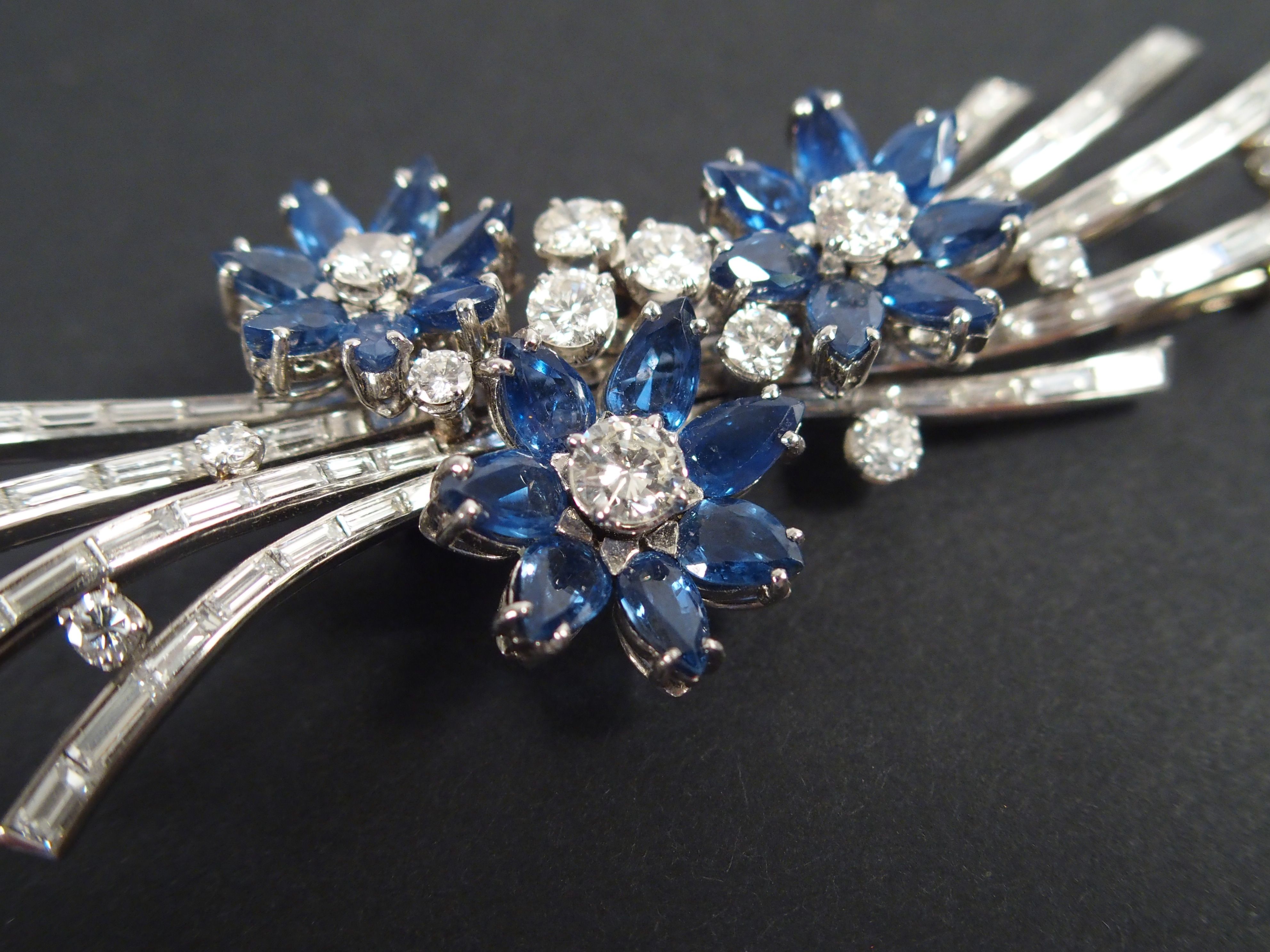 GUBELIN. Broche monture or blanc en diamants et saphirs à décor de fleurs. Le pistil des trois fleurs sont des brillants de 0,30cts environ, de 0,40cts environ et de 0,17cts environ. Les pétales sont en saphir taille poire. 8,5cm environ Poids tel: 33,3gr