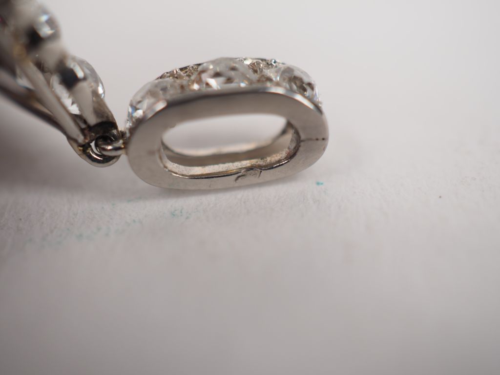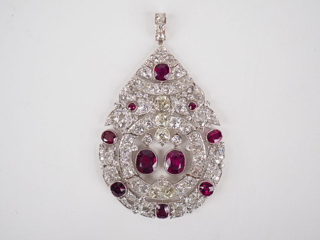 Important pendentif de style Art déco en platine, serti de diamants taille ancienne et de rubis dont deux en pendeloques au centre. 5,7 x 4 cm Poids tel. 21,05 g