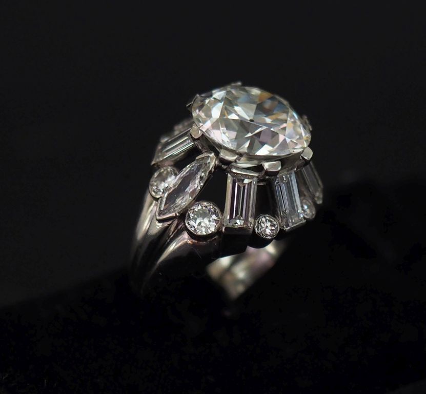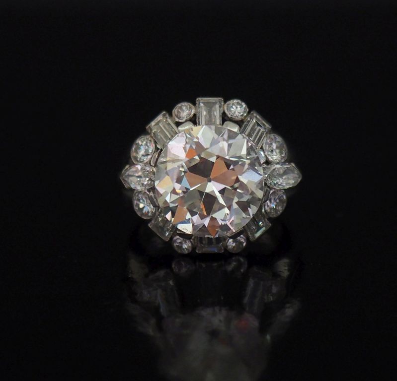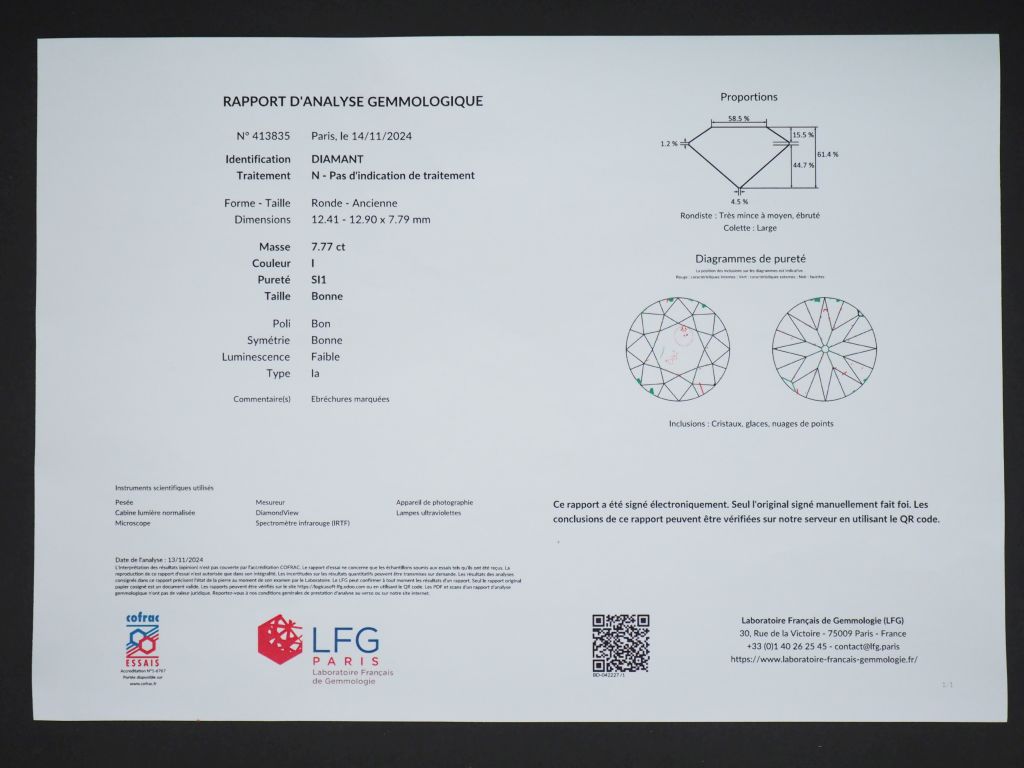 Importante bague dôme de style Art déco en platine, sertie en son centre d'un diamant taille ancienne de 7,77 ct I-SI1. Jolie monture ajourée sertie de diamants baguette, rond et navette. TDD. 54 Poids tel. 14,74 g Certificat du Laboratoire Français de Gemmologie en date du 14/11/2024