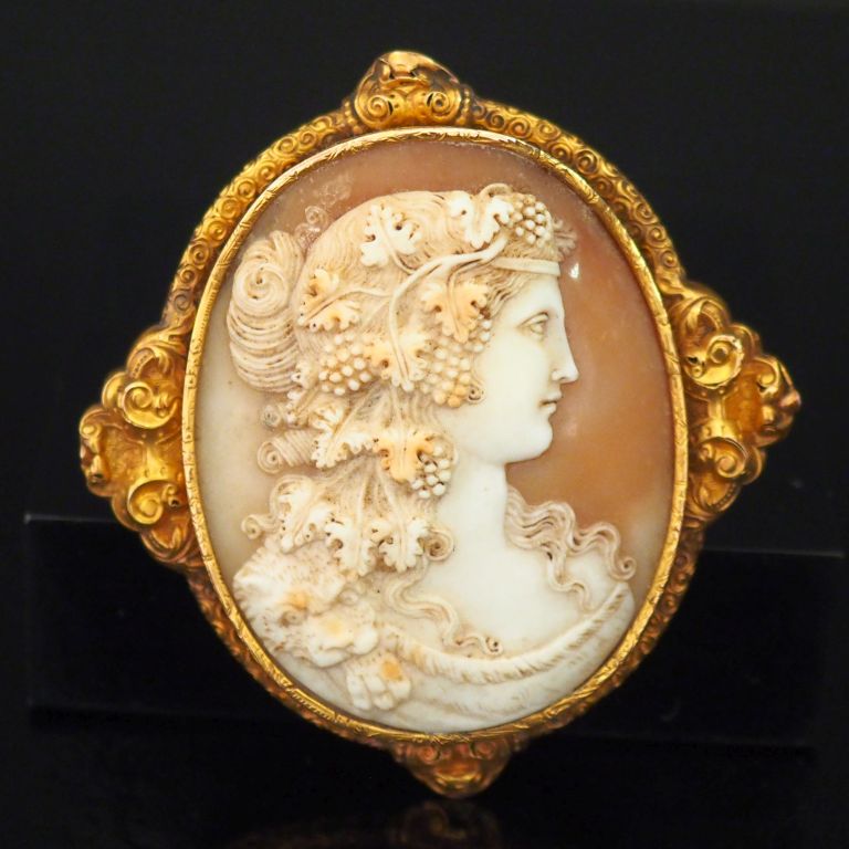 Importante broche en or jaune 750, sertie en son centre d'un camée figurant une jeune femme aux pampres. Très jolie monture, à décor d'enroulements et de consoles. 6,5 x 6,2 cm Poids tel. 21,95 g (petits accidents et restaurations à la monture, pique en métal)