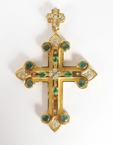Importante croix en or jaune montée en pendentif, ornée de 12 émeraudes taille brillant et taille navette et de 26 diamants taille moderne. 6,8 x 4,5cm Poids tel: 23,8gr