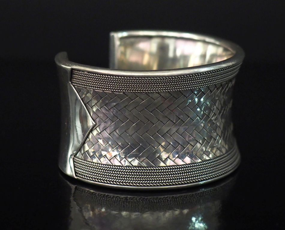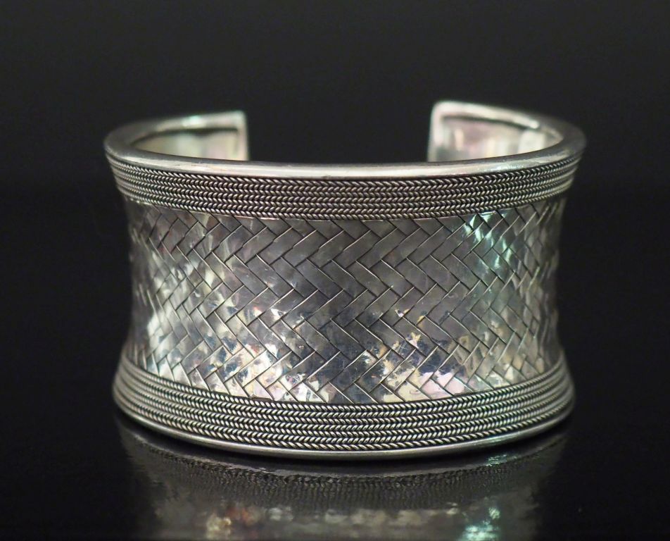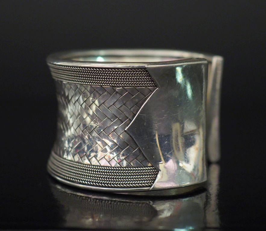 Large bracelet manchette en argent 925, à décor tressé au centre épaulée de motifs filigranés. Larg. 4 cm Poids. 78,91 g