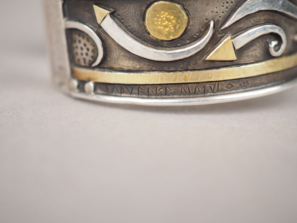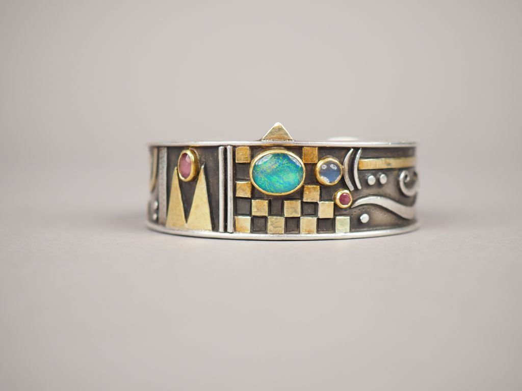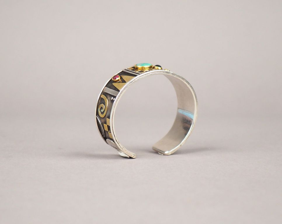 Linda LADURNER. Bracelet manchette en argent et pierres de couleur en serti clos, à décor de motifs géométriques. Signé. Largeur. 2,5 cm et 2 cm Poids tel. 62,14 g
