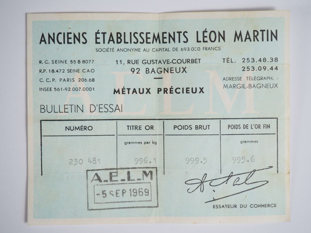 Lingot d'or Titre : 996,1 g numéroté 230481 Avec son certificat