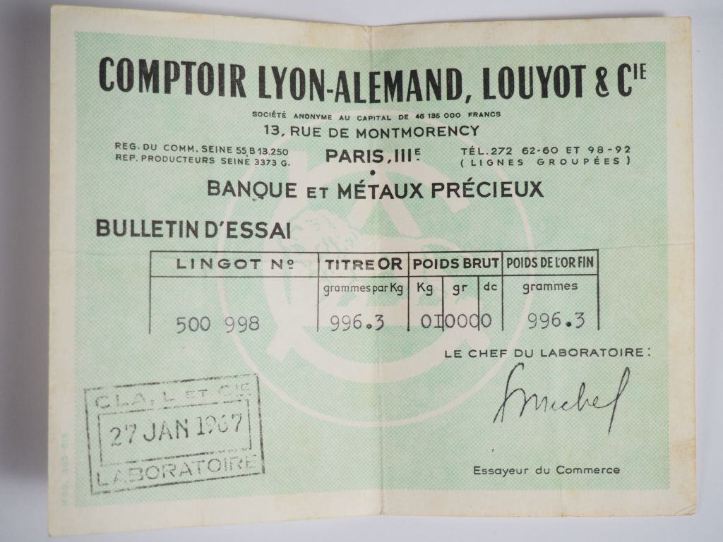 Lingot d'or Titre : 996,3 g numéroté 500998 Avec son certificat