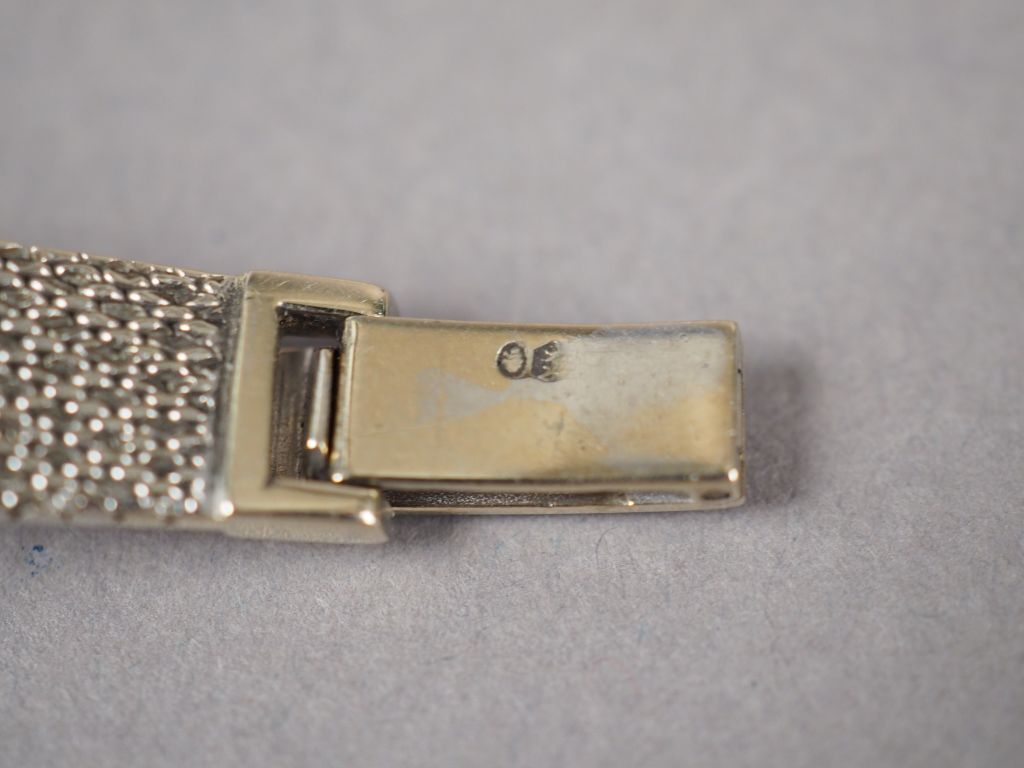 LONGINES. Montre de dame, bracelet et boitier en or blanc. Cadran entouré de petits diamants. Poids tel. 41,68 g