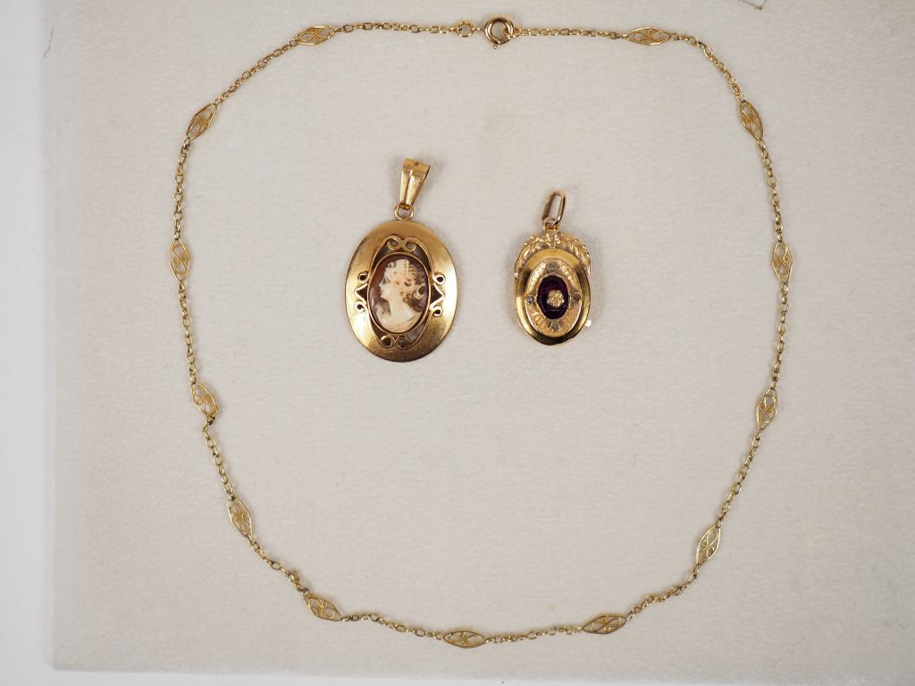 Lot comprenant : - un collier en or jaune, à décor de filigranes. Poids. 3,38 g - un pendentif orné d'un camée, monture en or jaune. - un pendentif en or jaune, pierre de couleur et perles (petits manques) Poids total tel. 10,89 g