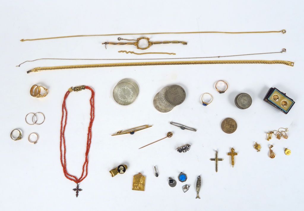 Lot comprenant : une broche argent et roses, un collier en corail, quatre pièces en argent et différents bijoux anciens en métal doré.