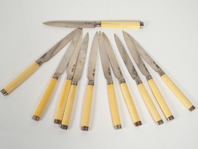 Lot de 11 couteaux à fromage, manche ivoire, embouts et viroles en argent. Par Herz. (Fentes).