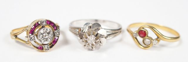 Lot de 3 bagues monture or jaune ou or blanc, ornées de diamants, rubis ou perle. Poids tel: