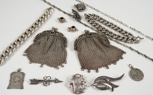 Lot de bijoux en argent comprenant 2 bourses de style Art Nouveau, 2 bracelets, pendentifs, un lot de broches et de médailles. Poids: 154gr