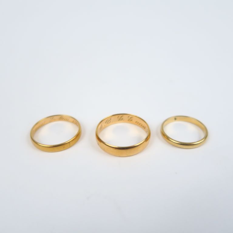 Lot de trois alliances en or jaune. Poids. 10,36 g (deux gravées)