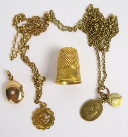 Lot d'or comprenant : deux chaines, trois médailles religieuses , un dé à coudre et médaillon porte photo avec sa vitre intérieure. L’ensemble en or. Poids sans le porte-photo : 23,5 g, poids tel avec le porte photo : 27,5 g