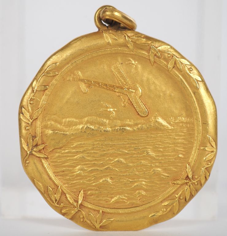 Médaille commémorative en or du Raid Paris Buenos-Aires portant la mention "Hommage aux aviateurs Costes et Le Brix des mutualistes français. République Argentine Octobre 1927". Poids : 17,82 g Diam. 3,5 cm