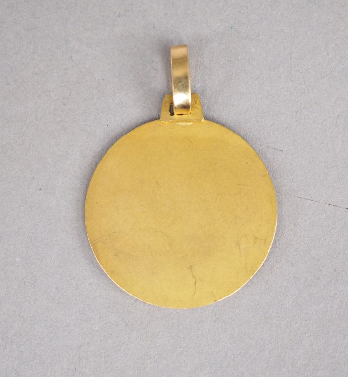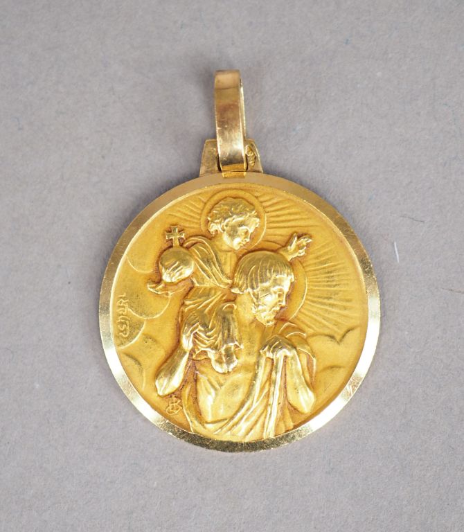 Médaille de baptême en or jaune figurant Saint Joseph et l'Enfant Jésus. Diam. 1,9 cm Poids. 3,83 g