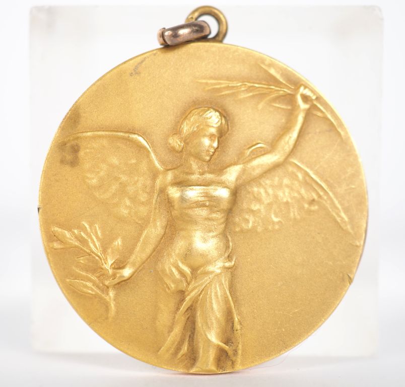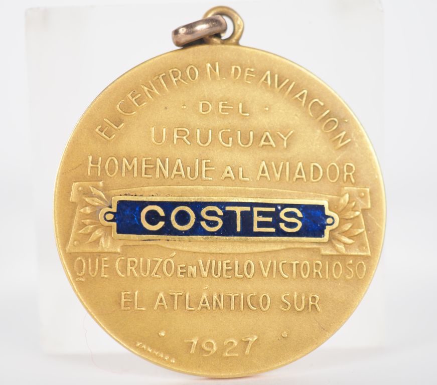 Médaille en métal doré, plaqué or. El Centro de Aviacion Del Uruguay "Homenage al Aviador Costes que cruzo en vuelo victorioso el Atlantico Sur 1927". Diam. 3,7 cm