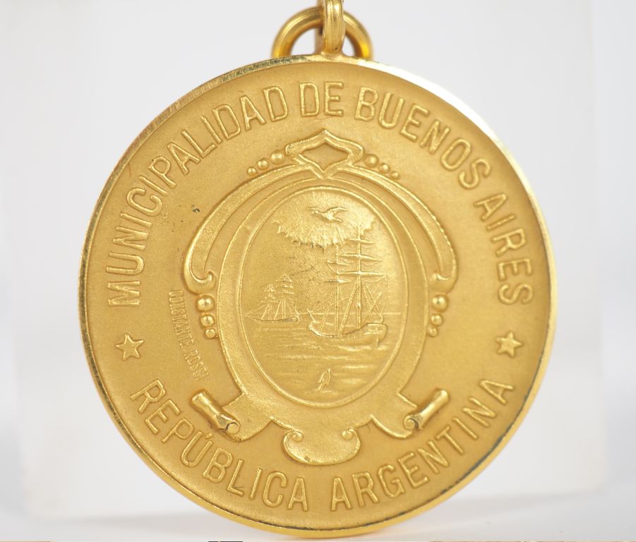 Médaille en or de la ville de Buenos-Aires offerte à Dieudonné Costes signée Constante Rossi. Sur une face : les armes de la ville de Buenos-Aires. Mention Municipalidad de Buenos-Aires Republica Argentina. Sur l'autre face : Dieudonné Costes dans un encadré émaillé bleu nuit. Paris, 10 octobre Buenos-Aires 20 octobre 1927 Poids : 17 g Diam. 3,2 cm