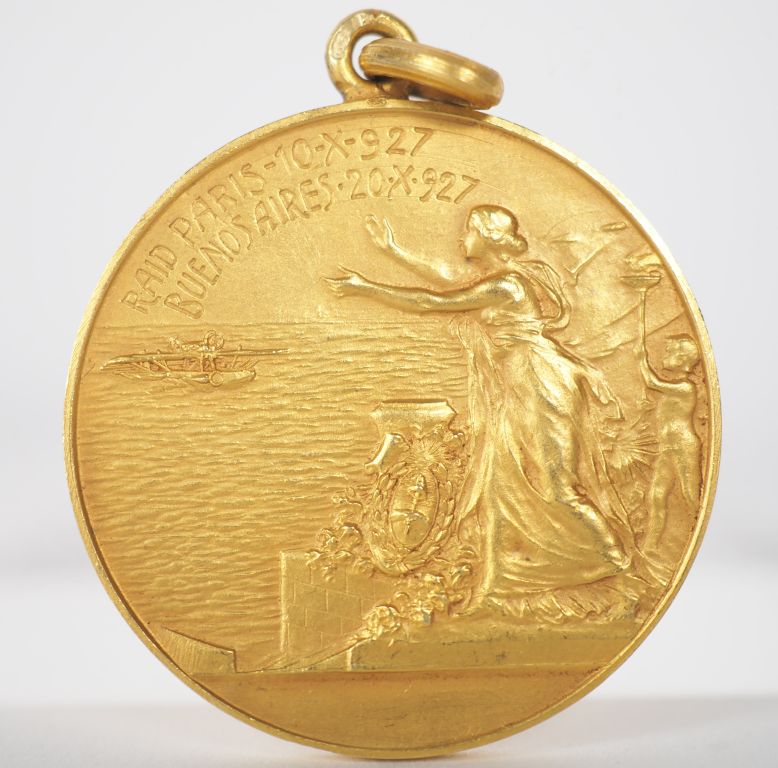 Médaille en or. Raid Paris Buenos-Aires 10 X 927 - 20 X 927 "Al piloto Dieudonné Costes, Club del Progress de Buenos-Aires 1927" Poids : 17,99 g Diam. 3,2 cm