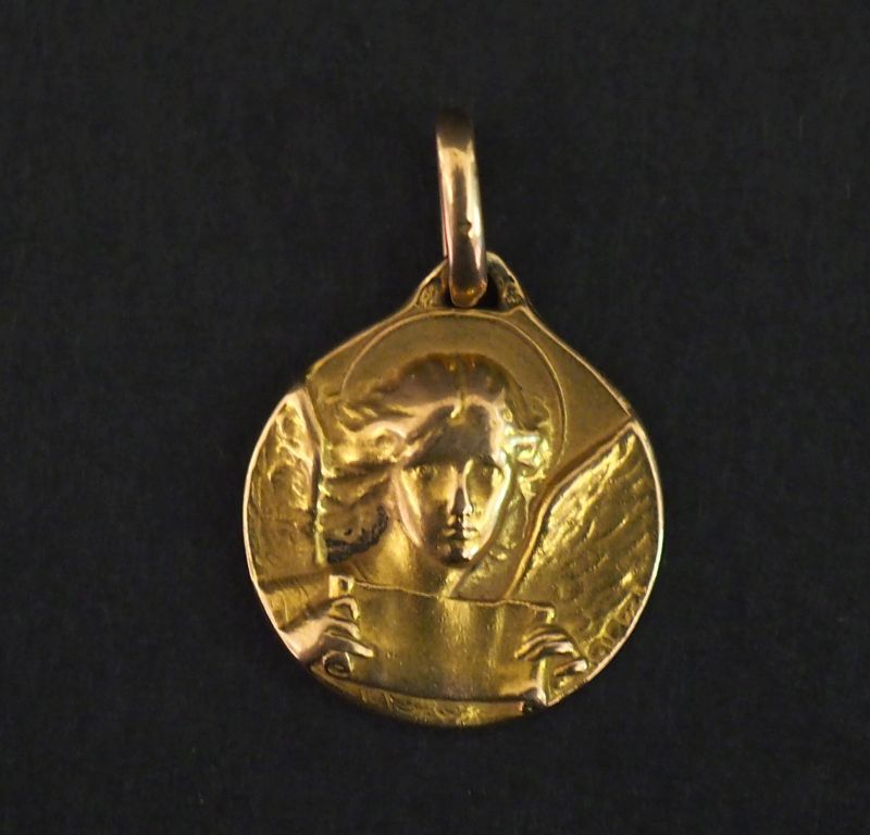 Médaille religieuse en or jaune 750, figurant un ange. Diam. 1,4 cm Poids. 1,79 g (monogrammée au revers)