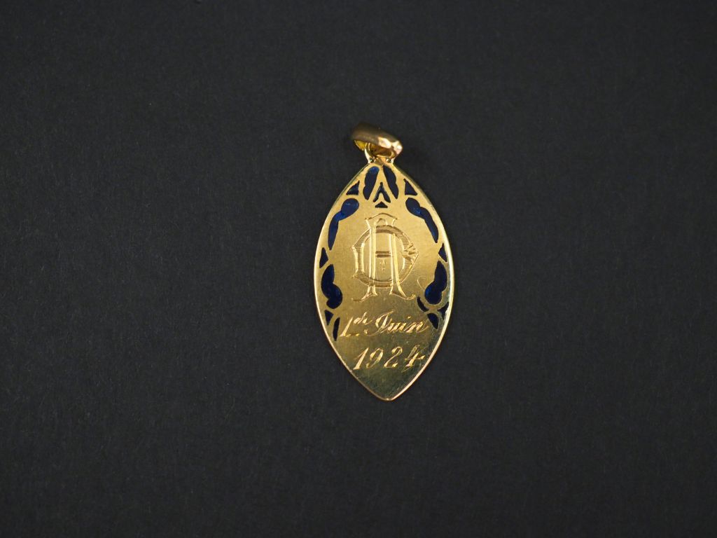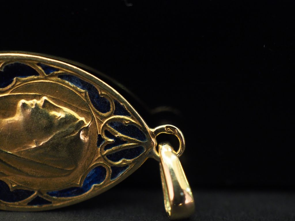Médaille religieuse en or jaune et émail bleu figurant la Sainte Vierge. H. 2,4 cm Poids tel. 2,45 g (gravée au dos)
