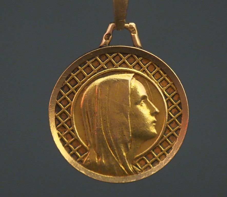 Médaille religieuse en or jaune, figurant la Sainte Vierge de profil sur fond quadrillé. Diam. 2,2 cm Poids. 3,86 g