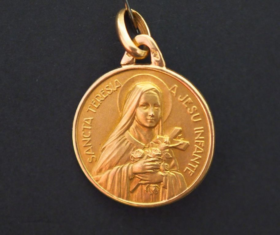 Médaille religieuse en or jaune, figurant Sainte Thérèse de l'Enfant Jésus. Gravée au revers "Je ferai tomber du ciel une pluie de roses". Diam. 1,8 cm Poids. 4,41 g