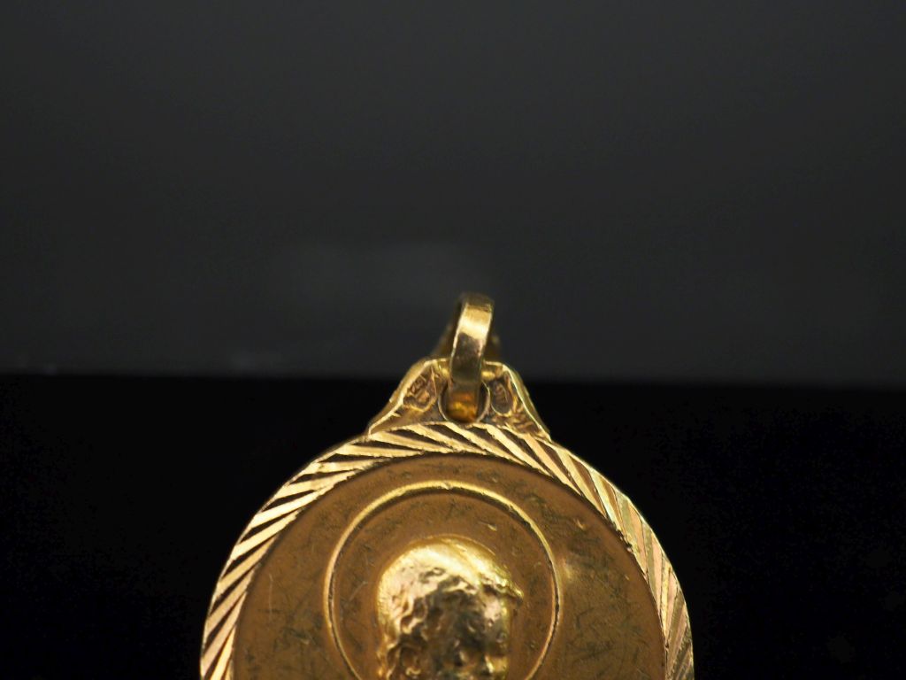Médaille religieuse en or jaune, figurant une jeune sainte en prière les mains jointes. Diam. 2 cm Poids. 3,76 g (petits enfoncements)