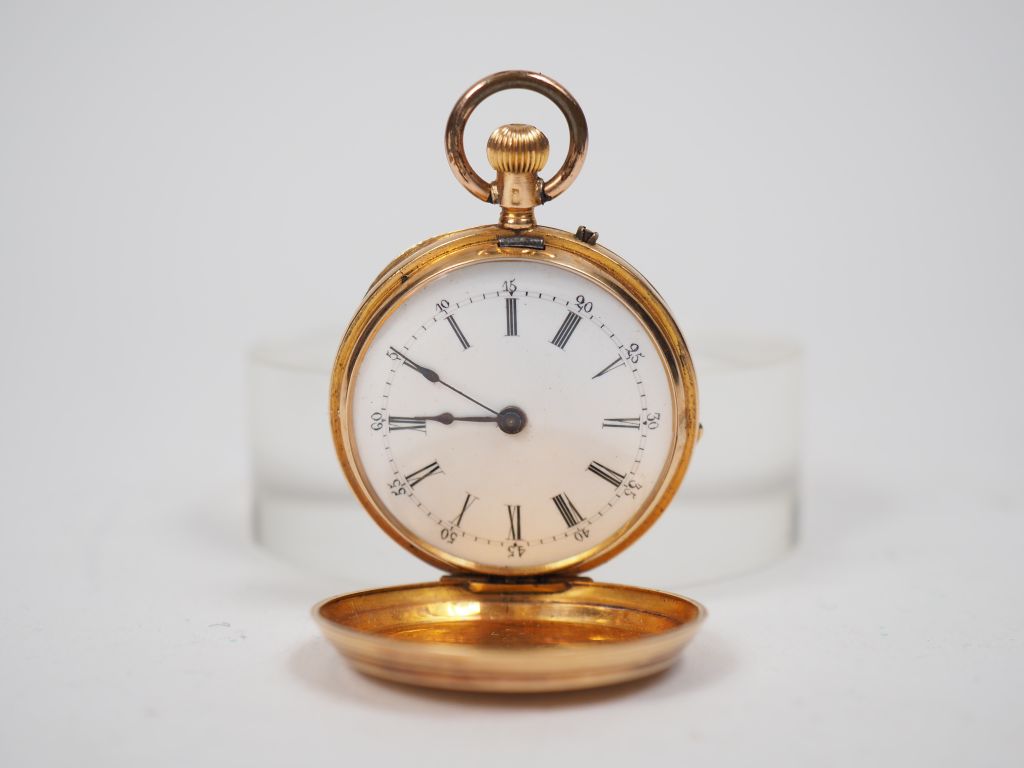 Montre de col en or jaune, à décor sur les deux côtés de cartouches feuillagés. Poids tel. 27,90 g
