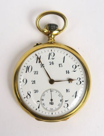 Montre de gousset en or, cadran émaillé, chronomètre à 6h. Signée Devor à Lyon. Poids tel : 68,6 g