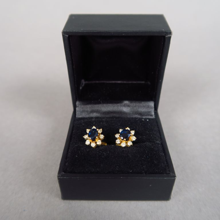 Paire de boucles d'oreilles en forme de marguerite, ornées d'un saphir et de petits brillants. Poids tel. 3,37 g
