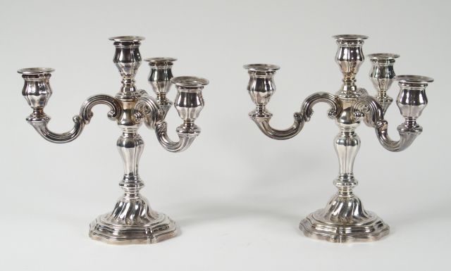 Paire de chandeliers de style rocaille en argent, poinçon Minerve, éclairant à 4 lumières. M.O : Tétard Frères Poids tel d'un chandelier : 1126 gr