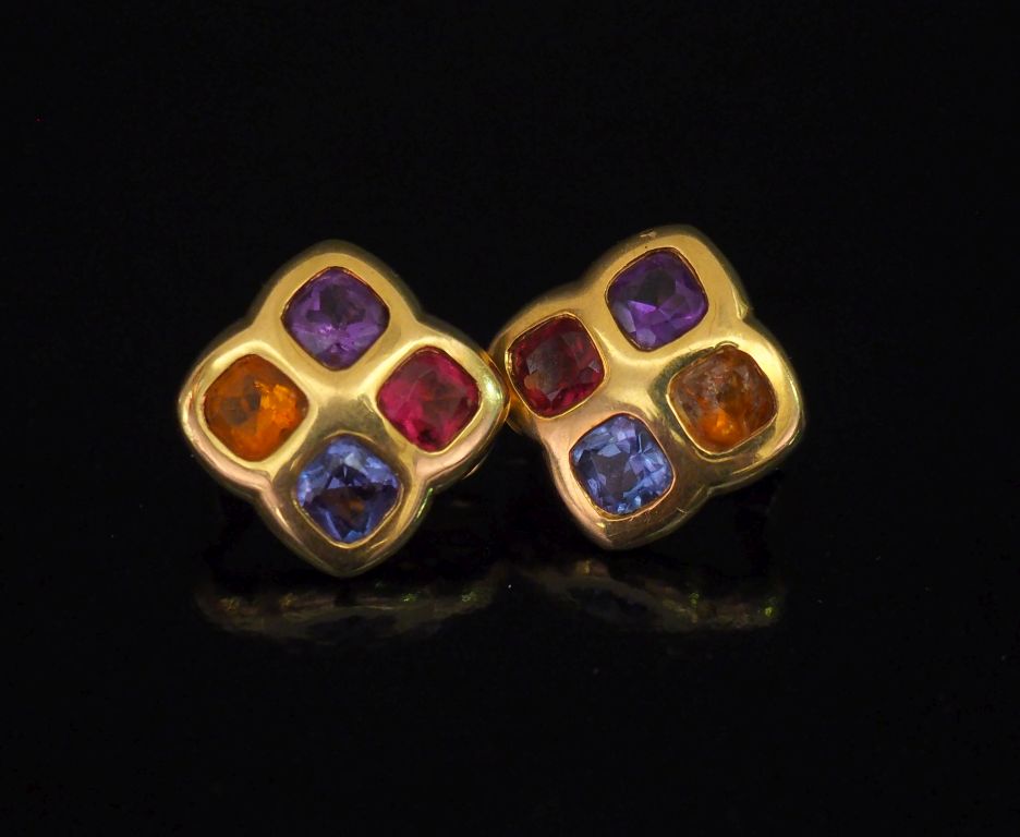 Paire de clips d'oreilles quadrilobés en or jaune 750, sertis de quatre pierres de couleur. 2 x 2 cm Poids tel. 11,82 g