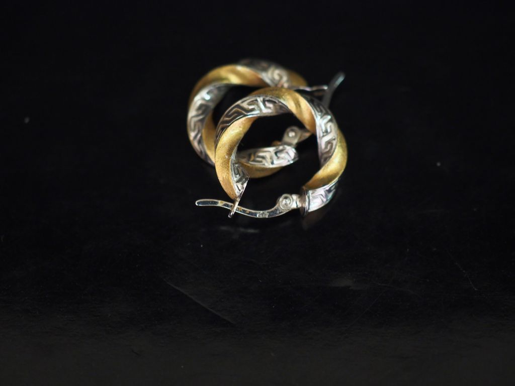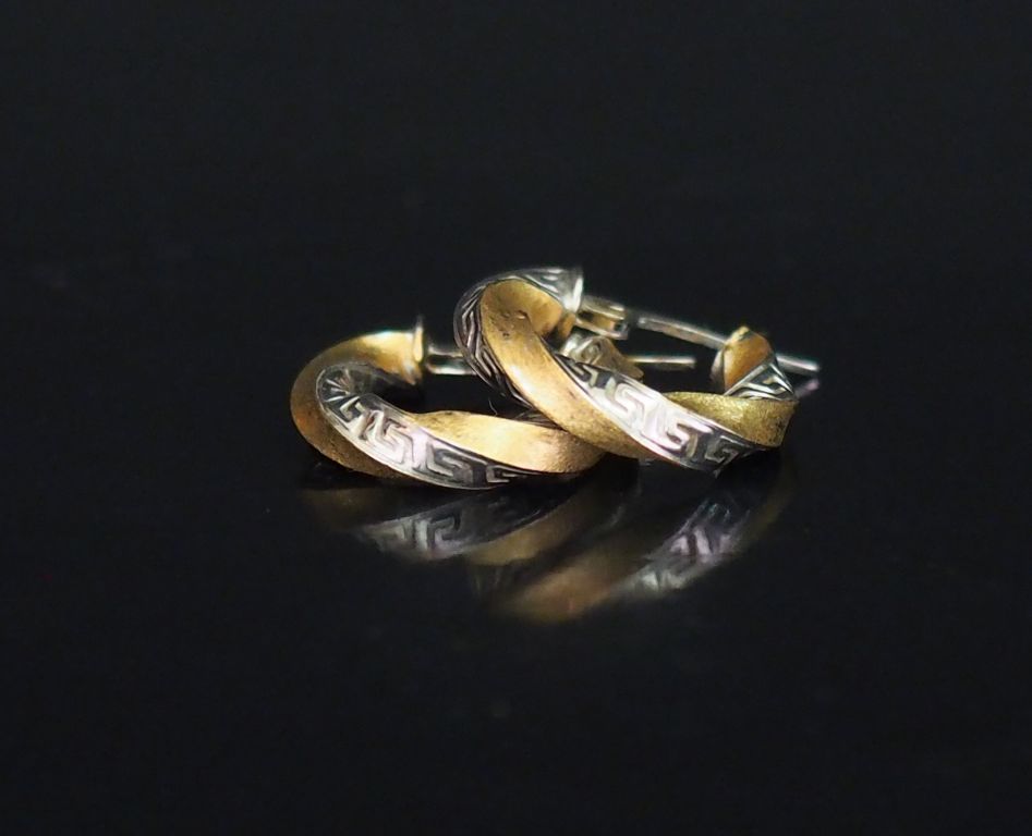 Paire de créoles deux tons d'or, à décor de motifs torsadés agrémentés de grecques. H. 1,5 cm Poids. 2,25 g