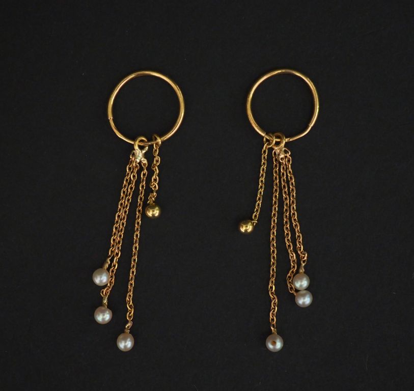 Paire de créoles en or jaune, agrémentées de petites chainettes serties de perles en pendeloques. H. 4,7 cm Poids tel. 1,55 g