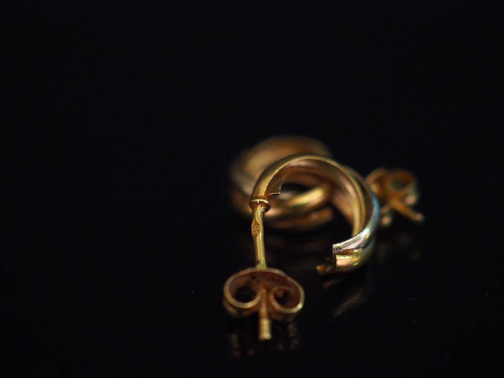 Paire de demi-créoles deux tons d'or, à décor de motifs torsadés. H. 1 cm Poids. 1,50 g