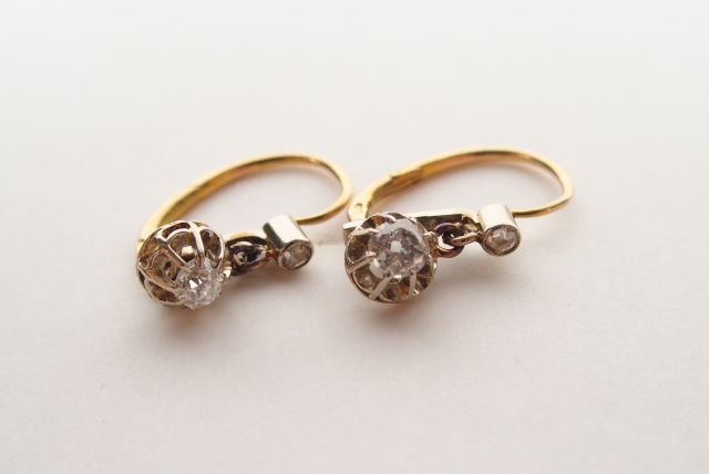 Paire de dormeuses monture or jaune, ornées chacun d'un diamant taille coussin de 0,15cts environ. Poids tel: 2,3gr