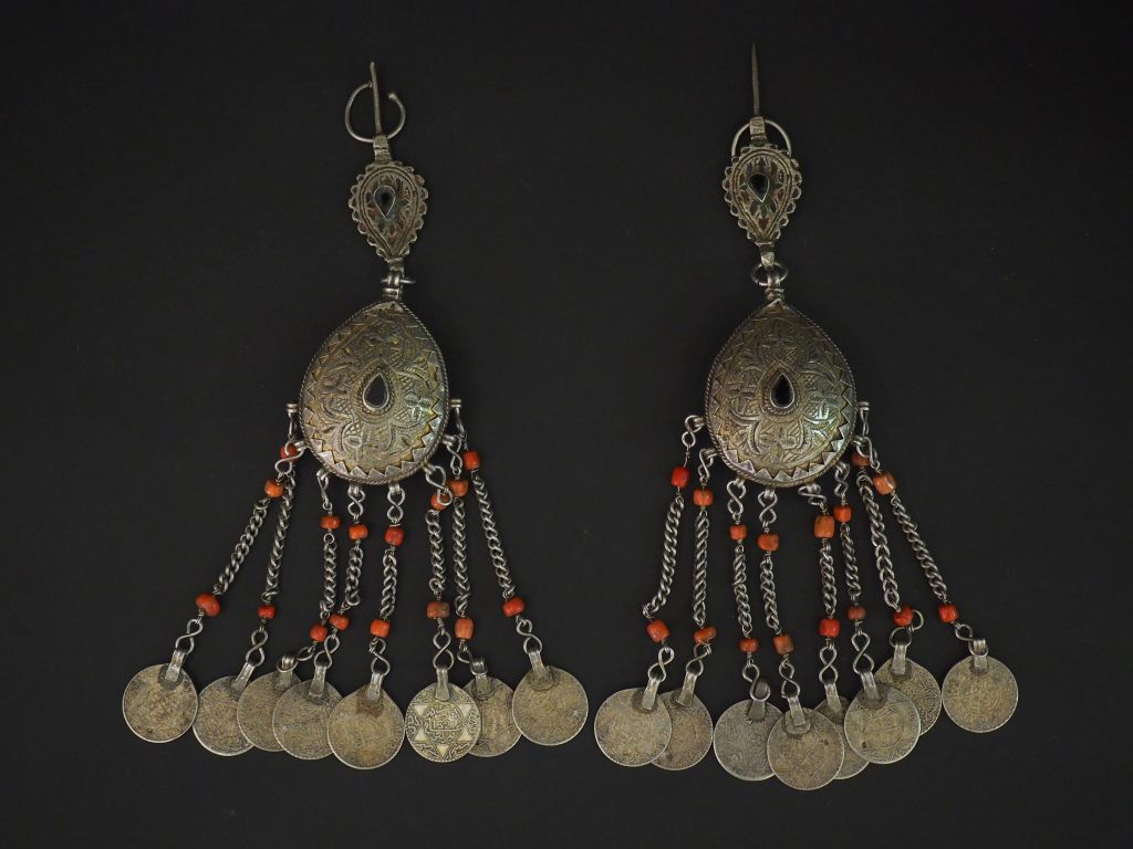 Paire de fibules Afrique du Nord en argent, à décor de pendeloques ornées de perles de corail. H. 25,5 cm Poids tel. 275 g (petits accidents)