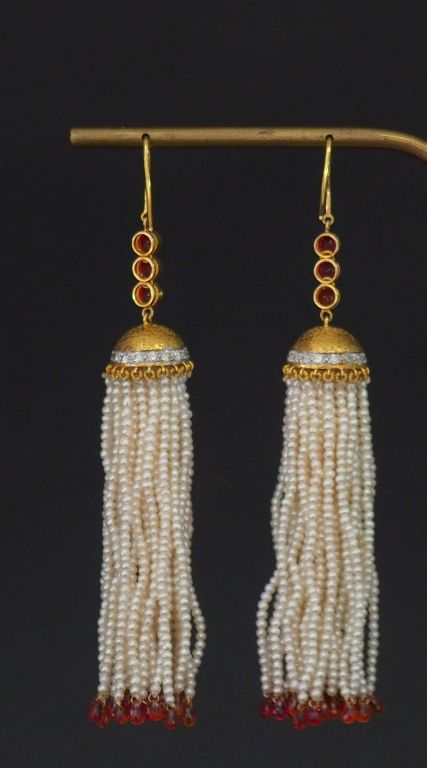 Paire de pendants d'oreilles en forme de pompons en or jaune, diamants, perles blanches et pierres de couleur. H. 11 cm Poids tel. 43,10 g